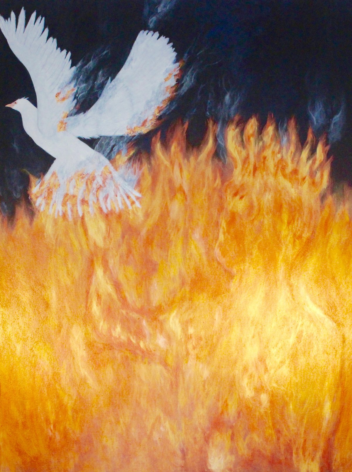 The firery Will dwells in us all, willing us to blaze a trail, that we can call our own. Blaze brightly and be illuminated. Painted in the glazing method with iridescent golds, coppers and whites.